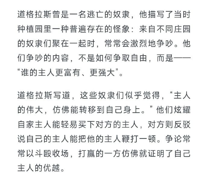 奴隶 Posted on 2025-10-25 In Clipping Views: 道格拉斯曾是一名逃亡的奴隶,他描写了种植园里一种普遍存在的怪象:来自不同庄园的奴隶们聚在一起时争吵,内容不是如何争取自由,而是“谁的主人更富有、更强大”。 道格拉斯写道,这些奴隶们似乎觉得,“主人的伟大,仿佛能转移到自己身上”。他们炫耀自家主人能轻易买下对方的主人,对方则反驳说自己的主人能把他的主人鞭打一顿。争论常常以斗殴收场,打赢的一方仿佛就证明了自己主人的优越。